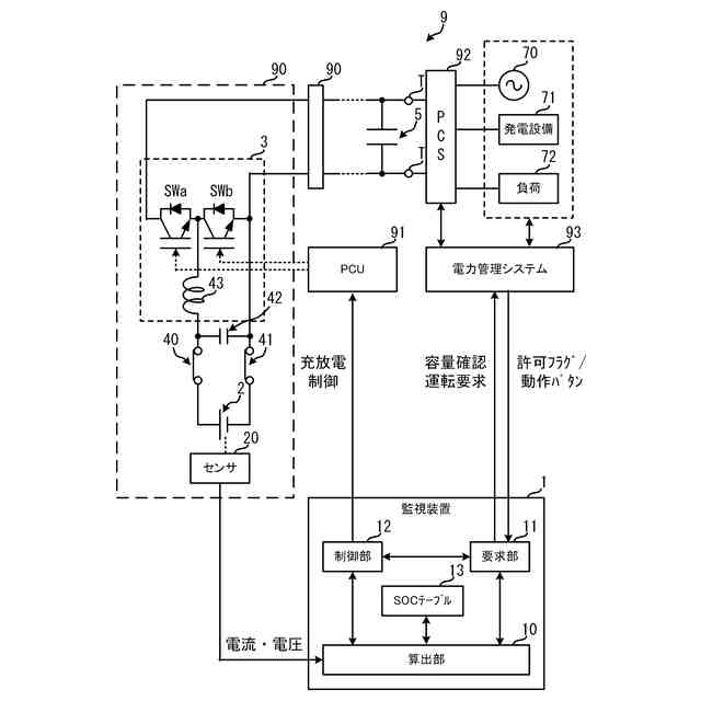 図1は、定置用蓄電システム9及び監視装置1の一例を示す構成図である。定置用蓄電システム9は、複数の蓄電ユニット90、PCU(Power Control Unit)91、PCS(Power Conditioning System)92、及び電力管理システム93を含む。複数の蓄電ユニット90は、出力コンデンサ5を挟んでPCS92に並列接続されている。PCS92は、例えばインバータであり、電力系統70、発電設備71、負荷72側の交流電流と定置用蓄電システム9側の直流電流を相互に変換する。