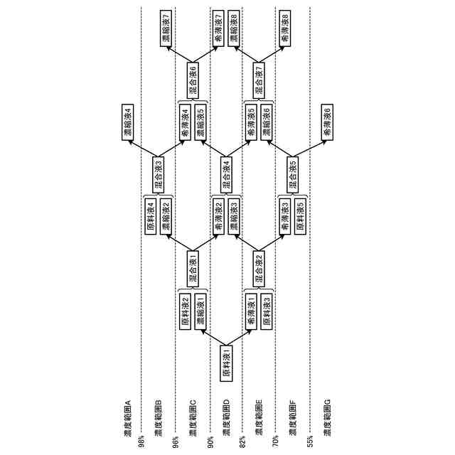 特定の成分に関して第1の濃度範囲を有する液体を、前記第1の濃度範囲よりも濃度が高い第2の濃度範囲を有する第1の濃縮液体と、前記第1の濃度範囲よりも濃度が低い第4の濃度範囲を有する第1の希薄液体とに分配する分配工程と、