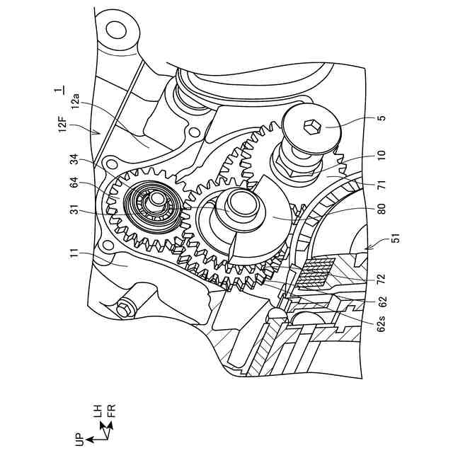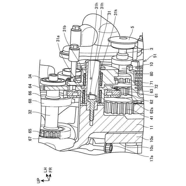 クランクケース11には、車幅方向に沿わせてクランク軸10が回転自在に支持される。また、クランクケース11には、クランク軸10の後下方に、メイン軸21が回転自在に支持され、クランク軸12及びメイン軸21よりも下方にカウンタ軸22が回転自在に支持される。さらに、クランクケース11には、クランク軸10の後上方、かつクランクケース11右側に、アイドラーギア支持軸31が回転自在に支持され、アイドラーギア支持軸31の上方、かつクランクケース11右側に、カムチェーン駆動軸32が回転自在に支持される。クランク軸10、メイン軸21、カウンタ軸22、アイドラーギア支持軸31、及びカムチェーン駆動軸32は互いに平行である。