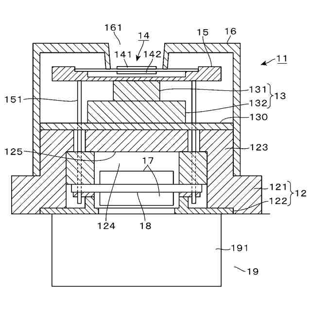 図1は比較形態の感知装置11の縦断側面図、図2はその外観斜視図である。これらの図に示す感知装置11は、ベース本体121と裏蓋部122とからなるベース部12を備えている。ベース本体121は平面視円形のブロックにより構成され、その上面側の中央部に平面視円形の突起部123を備えている。