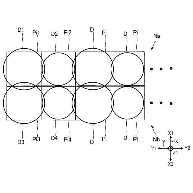 前記第1ドットと前記第3ドットとは、前記第1軸に直交する第3軸に沿って連続して並ぶ、