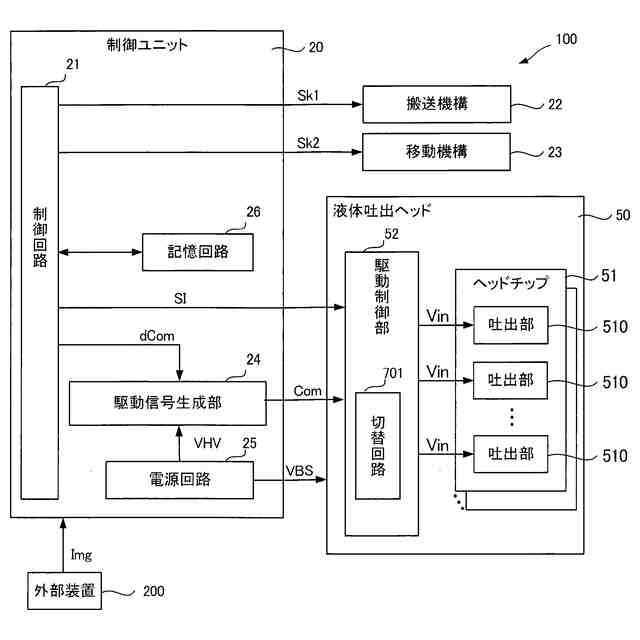 媒体上に液体を吐出する第1ノズルと、前記第1ノズルに連通する第1圧力室と、供給された第1個別駆動信号に応じて前記第1圧力室内の液体に圧力変動が生じるように駆動する第1駆動素子と、を有する第1吐出部と、