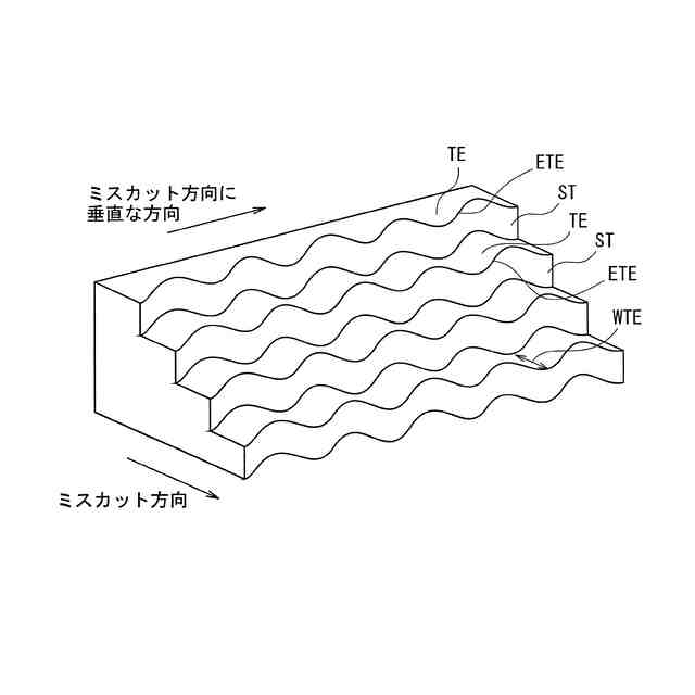 前記波形状の前記テラス端の2つの山同士を結んだ第1の直線と、前記テラス端の2つの谷同士を結んだ第2の直線との間に引かれた垂線の距離が、50nm以上150nm以下である