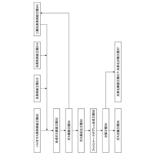 /CO比調整工程を経た合成ガスから硫黄成分を取り除く脱硫工程と、脱硫工程を経た合成ガスから液体燃料を製造する燃料製造工程と、を経てバイオマス原料から液体燃料が製造される。