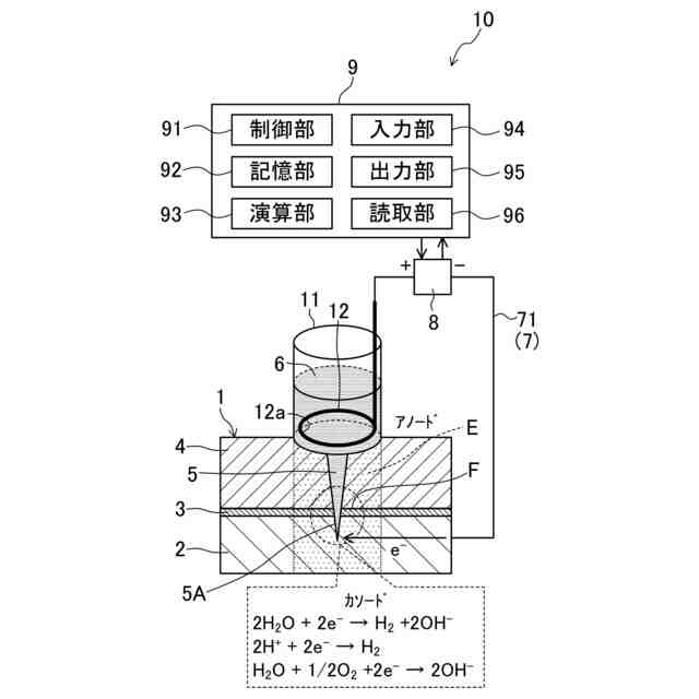 本構成では、電極及び金属製基材、又は、2つの電極の一方及び他方を、それぞれアノード及びカソードとして、両者間に通電する。電極をアノード、金属製基材をカソードとして通電した場合、表面処理膜中に浸透した含水材料が金属製基材に到達すると、含水材料と金属製基材との接触部においてカソード反応が進行する。また、2つの電極の一方をアノード、他方をカソードとした場合、アノードとなっている電極側に位置する金属製基材と含水材料との接触部においてカソード反応が進行する。さらに、いずれの場合も、通電条件によっては、すなわち、例えば水の電気分解により水素が発生する理論電圧(系の温度が25℃の場合、1.23V)以上の電圧又はそのような電圧を要する電流を印加するような通電条件の場合には、水の電気分解も進行し、水素ガスが発生する。