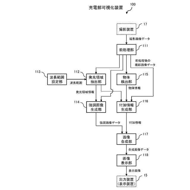 【解決手段】充電部可視化装置は、情報処理装置と、電気設備が存在する現場を撮影した画像データである撮影画像データを出力する撮影装置と、表示装置と、を備え、情報処理装置は、撮影画像データに基づく画像について、電気設備の充電部に設けられた、充電部が通電されているときに生じるコロナ放電により発光する発光部材が発する所定波長範囲の光が写っている領域である発光領域を検出する発光領域検出部と、撮影画像データについて、発光領域を強調したデータである強調画像データを生成する協調画像生成部と、強調画像データに基づく表示画像を表示装置に表示させる画像表示部と、を含む。