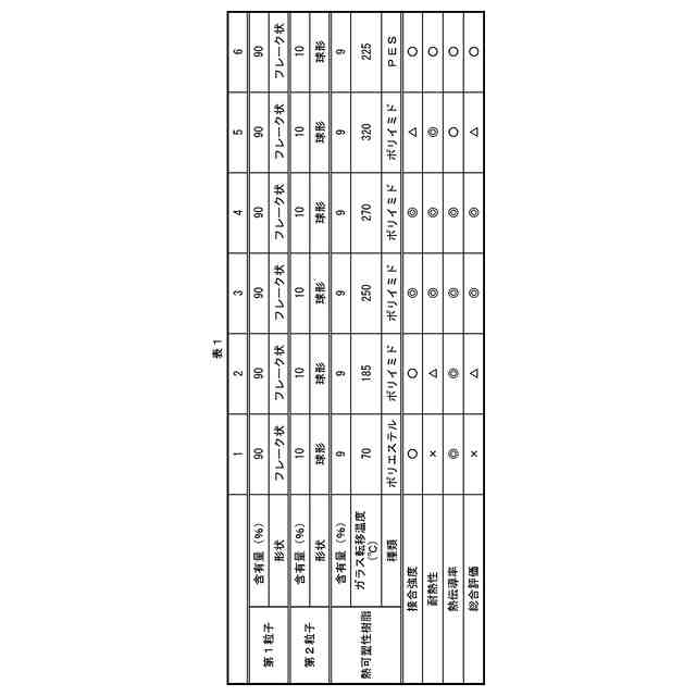 本発明者らは、ろう材に代わる新規な接合材について検討を重ねた結果、放熱基板用の接合材に熱可塑性樹脂を使用することに思い至った。この熱可塑性樹脂は、ガラス転移点以上の温度で加熱すると軟化する。この状態で接合対象を挟持しながら冷却すると、熱可塑性樹脂が硬化するため接合対象を接合できる。この熱可塑性樹脂を利用した接合方法を採用すると、従来よりも低温(250℃~300℃程度)かつ短時間(10分程度)で放熱基板を製造できる。一方で、硬化後の熱可塑性樹脂は、ろう材を溶融硬化させた金属層と比べて耐熱性や熱伝導性に劣る。そこで、本発明者は、熱伝導粒子を含む粉体材料(以下、「熱伝導材」という。)と熱可塑性樹脂とを混合したものを接合材として使用することを考えた。そして、種々の実験と検討の結果、D