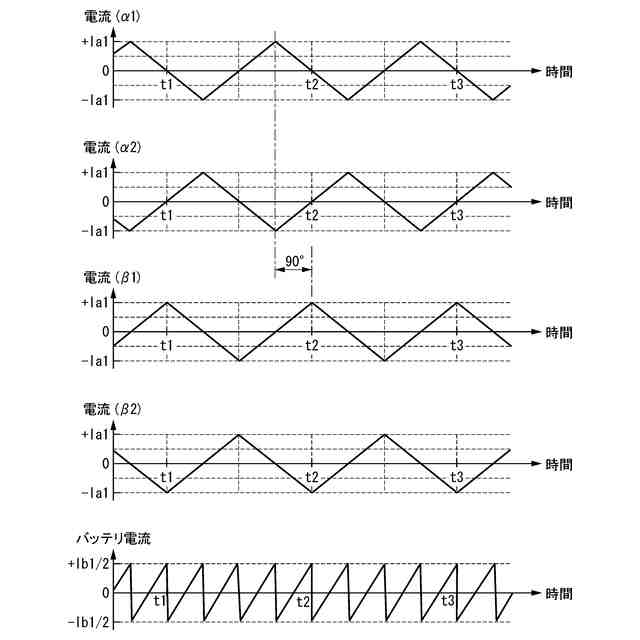 (3):上記(2)に記載の電気機器では、前記複数の第1コイルと前記複数の第2コイルとの空間位相は直交し、前記複数の第1コイル及び前記複数の第2コイルはオープンエンドであり、前記電力制御ユニットは、前記第1温度取得部及び前記第2温度取得部によって取得される各温度に応じて、前記複数の第1フルブリッジ回路のスイッチング位相と、前記複数の第2フルブリッジ回路のスイッチング位相との位相差を90°にしてもよい。