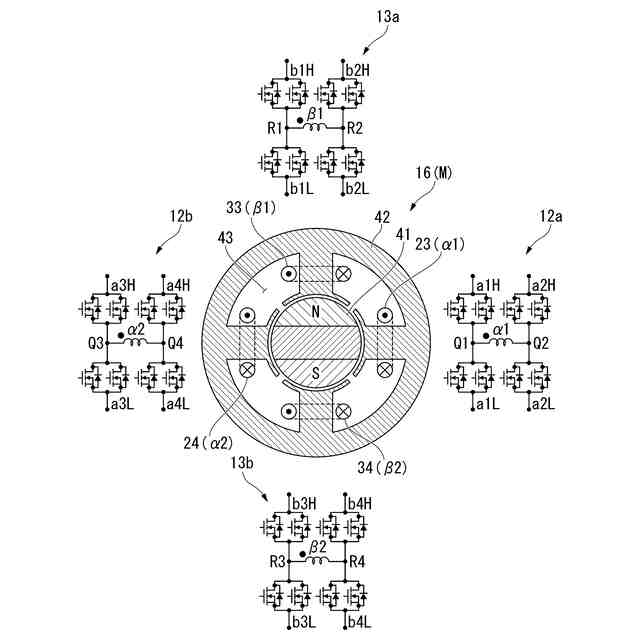(2):上記(1)に記載の電気機器では、前記回転電機は、スロット(例えば、実施形態でのスロット43)が形成されるステータコア(例えば、実施形態でのステータコア42)を備え、前記複数のコイルは、前記ステータコアのスロット(例えば、実施形態でのスロット43)を共有する磁気結合される複数の第1コイル(例えば、実施形態でのα相第1コイル23(α1)、α相第2コイル24(α2))と、前記ステータコアのスロット(例えば、実施形態でのスロット43)を共有する磁気結合される複数の第2コイル(例えば、実施形態でのβ相第1コイル33(β1)、β相第2コイル34(β2))とを備え、前記電力制御ユニットは、前記複数の第1コイルに接続される複数の第1フルブリッジ回路(例えば、実施形態での第1フルブリッジ回路12a、第2フルブリッジ回路12b)と、前記複数の第2コイルに接続される複数の第2フルブリッジ回路(例えば、実施形態での第3フルブリッジ回路13a、第4フルブリッジ回路13b)とを備え、前記第1モードでは、前記複数の第1フルブリッジ回路及び前記複数の第2フルブリッジ回路の各々のスイッチング位相を逆相とし、前記第2モードでは、前記複数の第1フルブリッジ回路及び前記複数の第2フルブリッジ回路の各々のスイッチング位相を同相としてもよい。