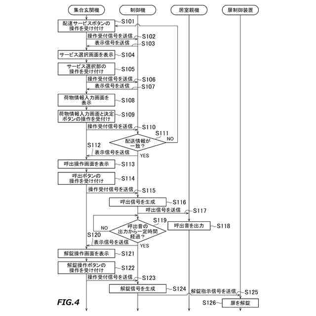 図4は、インターホンシステムにおける集合玄関機、制御機、居室親機および扉制御装置の動作例を説明するためのフローチャートである。