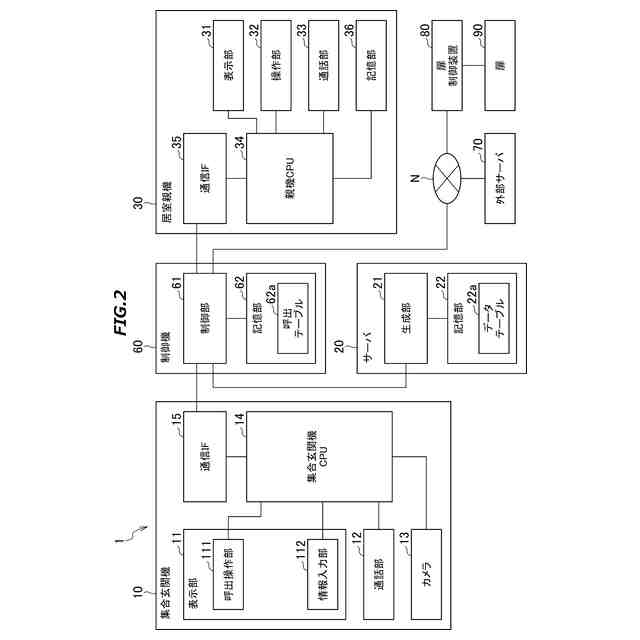 図2は、インターホンシステムの集合玄関機、サーバ、居室親機、および制御機の機能ブロック図である。