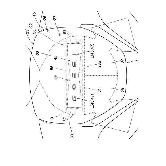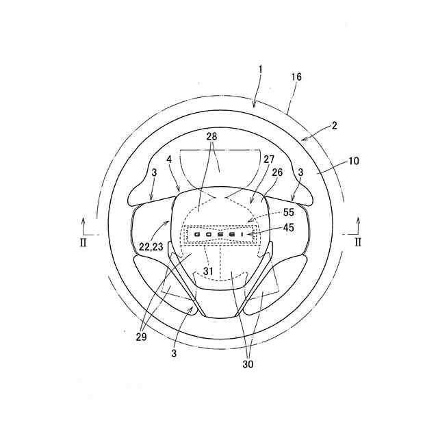 この従来のステアリング装置用パッドでは、レンズは、左右に幅広とした略長方形板状とされており、可視光光源は、レンズの左右両端(長手方向の両端)側となる2箇所に、配設される構成であった。また、意匠部(透光部)自体も、レンズの前後左右の中央付近において左右に延びる領域に、配設される構成であった。すなわち、従来のステアリング装置用パッドでは、レンズは、上下方向側から見た状態において、単なる略長方形状とされており、また、上下方向側から見た状態において、可視光光源と意匠部(透光部)の左右の中央との離隔距離も大きいことから、可視光光源の点灯時に発光される可視光が、意匠部(透光部)の左右の中央付近の領域まで届き難く、意匠部を全域にわたって均一に光らせ、意匠性を良好とする点に、改善の余地があった。