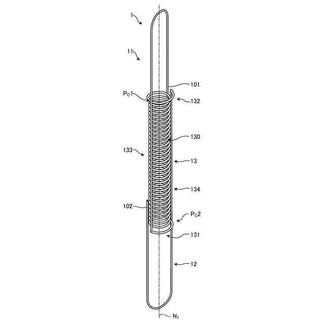 前記第1および第2端部は、前記ばね部と比して、前記線材のなす径が大きく、