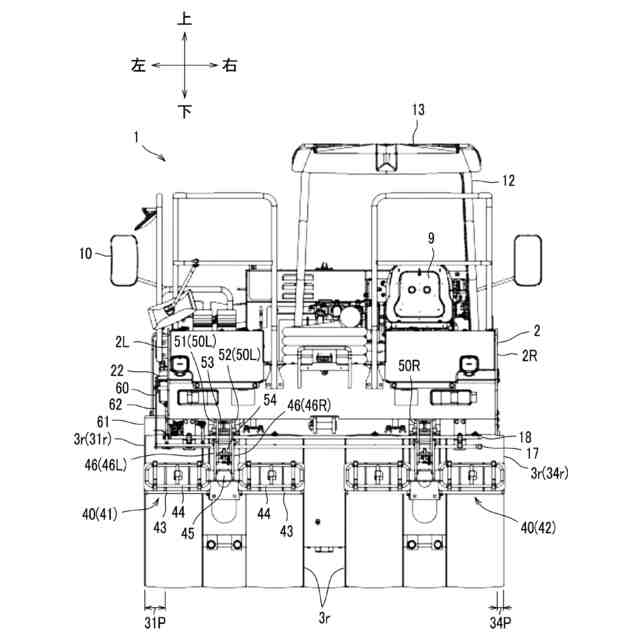 ところで、タイヤローラにおいては、駆動輪である車体後方側の転圧輪(以下、後方転圧輪とも表記する)の外側の端面が車体の幅方向で最も外側に位置しており、最外側に配置された後方転圧輪がタイヤローラの車体側面よりも張出している。転圧作業は、転圧する対象の路面の端に後方転圧輪の端を合わせる作業から開始する。その際、オペレータは、周囲の安全確認、転圧する箇所の際合わせ、路肩への幅寄せ等をするために、直接目視により、あるいはサイドミラーを使って、後方転圧輪の端面の位置を確認している。