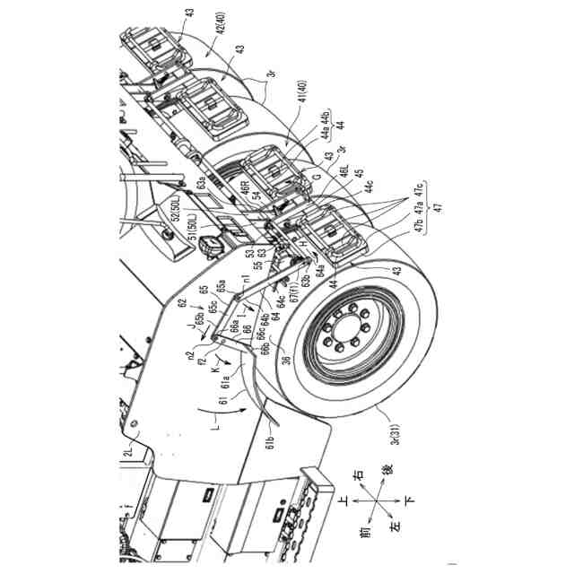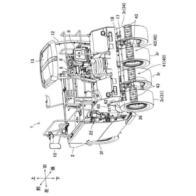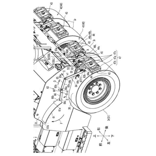 また、タイヤローラは、転圧作業を行わない場合、所定の待機場所等に回送される。特に回送時には、タイヤローラの最高速で走行するため、泥を含む水滴は後方転圧輪から広い範囲に飛散しやすくなる。
