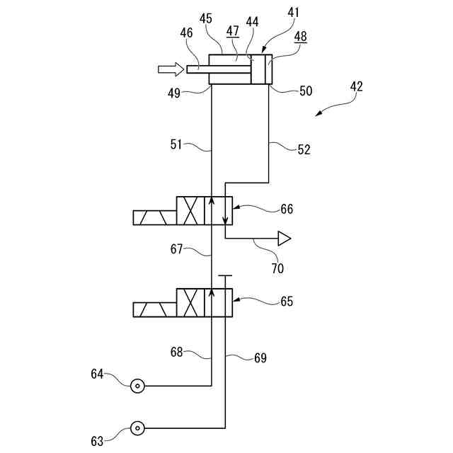前記付勢手段の付勢力を、前記ピストンが前記後退位置から前記中間位置に変位するときの作動流体の作動圧による推力よりも大きく、かつ、前記ピストンが前記中間位置から前記前進位置に変位するときの作動流体の作動圧による推力よりも小さくなるように設定しておき、