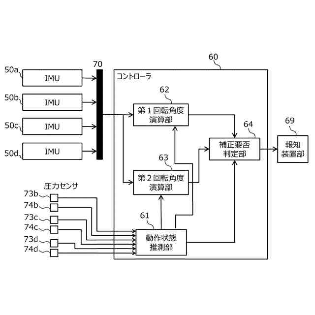 【解決手段】フロント部材31に取り付けられた角速度センサ及び加速度センサ(IMU50a)と、該角速度センサ及び該加速度センサの出力を用いて該フロント部材31の姿勢を演算するコントローラ60とを建設機械100に備える。コントローラ60は、該フロント部材31の動作中の該角速度センサによる検出角速度の積分値を第1回転角度θ1として演算し、該フロント部材31の該動作の前後における該加速度センサによる検出角度の差分を第2回転角度θ2として演算し、第1回転角度と第2回転角度との乖離が所定値δ1以上のとき該角速度センサのスケールファクタの補正が必要であることを報知装置69に出力する。