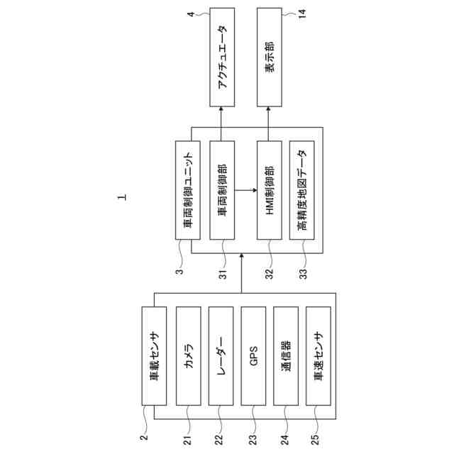 実施例1における表示装置は、自動運転車両(以下「自車1」とも記載する。)に適用されたものである。自動運転車両は、目的地の入力によりまず目標走行経路が生成される。次に、生成された目標走行経路に沿って走行するように速度及び舵角によって自車1が制御される。以下、実施例1の構成を、「全体構成」、「制御ブロック構成」、「車両制御ユニット3の処理構成」に分けて説明する。