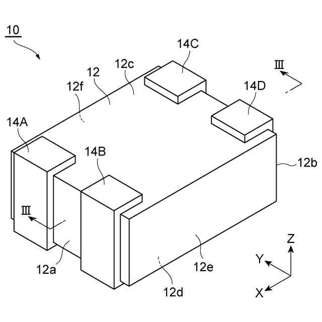 前記素体の前記第1の端面に設けられて前記第1の平面コイルパターンの外側端部と接続された第1の外部端子電極、前記素体の前記第1の端面に設けられて前記第1の平面コイルパターンの外側端部と接続された第2の外部端子電極、前記素体の前記第2の端面に設けられて前記第3の平面コイルパターンの外側端部と接続された第3の外部端子電極、および、前記素体の前記第2の端面に設けられて前記第4の平面コイルパターンの外側端部と接続された第4の外部端子電極と