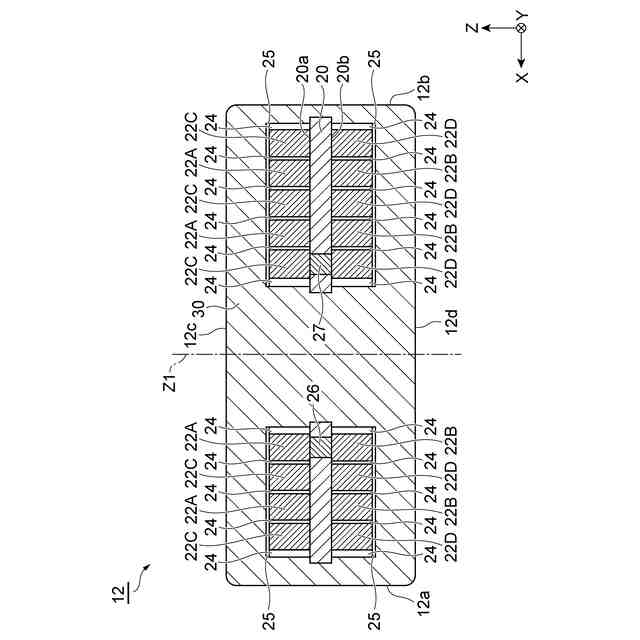 前記素体内に設けられ、前記第1の端面および前記第2の端面に対して直交し、かつ、前記第1の端面と前記第2の端面との間に亘って延在する絶縁基板と、
