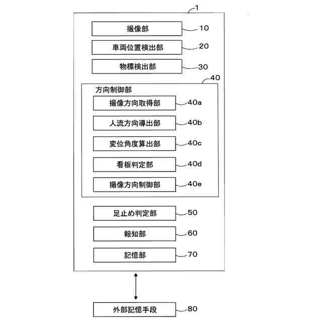 (1)上述した課題を解決すべく提供される本発明の人流取得装置は、車両に搭載された撮像部により撮像して得られる画像に基づいて前記車両の周囲の人流を取得する人流取得装置であって、前記車両の位置を検出する車両位置検出部と、前記車両の位置に対応付けて予め設定される前記撮像部による撮像方向を人流取得方向として記憶した方向記憶部と、前記車両位置検出部により検出された前記車両の位置に対応する人流取得方向を前記方向記憶部から取得する取得部と、前記撮像部の撮像方向を制御する方向制御部と、を備え、前記方向制御部は、前記取得部が取得した前記人流取得方向に向けて、前記撮像部の撮像方向のプリセットを行うことを特徴としている。