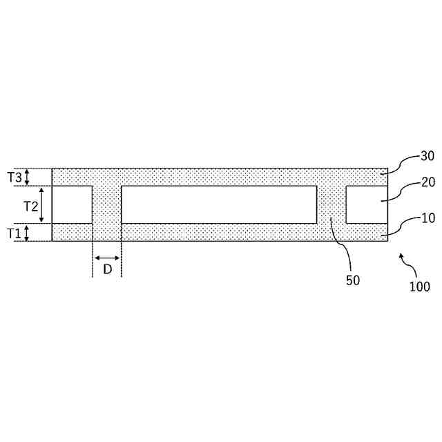 当該両面導電シートの積層方向における、前記下層、前記中間シート、前記上層のそれぞれの、厚みを、T1,T2,T3としたとき、
