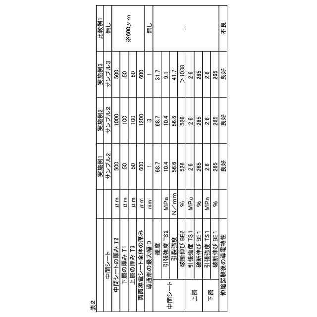 BE2>BE1かつBE2>BE3、および/または、TS2>TS1かつTS2>TS3を満たす、両面導電シート。
