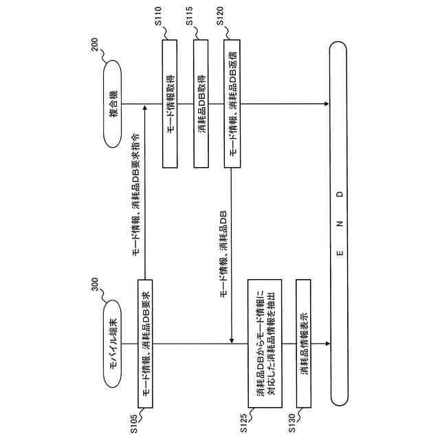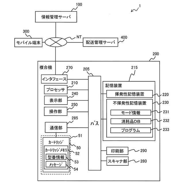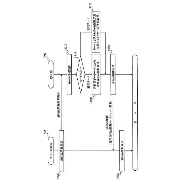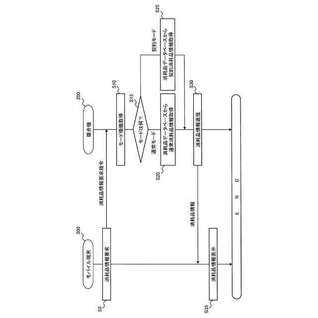 【解決手段】契約消耗品を使用できる契約モードと、契約消耗品を使用できず、通常消耗品を使用できる通常モードとを切り替え可能なプロセッサ210を備え、プロセッサ210は、複合機200と通信可能なモバイル端末300からの消耗品情報の要求に応じて、プロセッサ210が通常モードである場合は通常消耗品の型番情報を表す消耗品情報をモバイル端末300に表示させ、プロセッサ210が契約モードである場合は契約消耗品が使用可能であることを表す消耗品情報をモバイル端末300に表示させる処理と、を実行する。