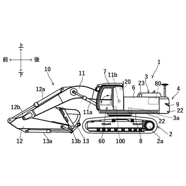 図1は、油圧ショベル1の側面図である。説明の便宜上、図1に示すように油圧ショベル1の前後及び上下方向を規定する。つまり、本実施形態では、特に断り書きのない場合は、運転席の前方(同図中では左方向)を油圧ショベル1の前方とする。