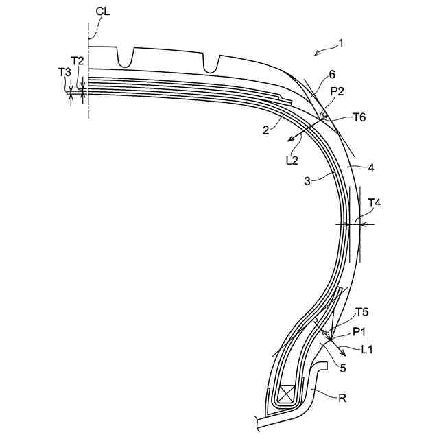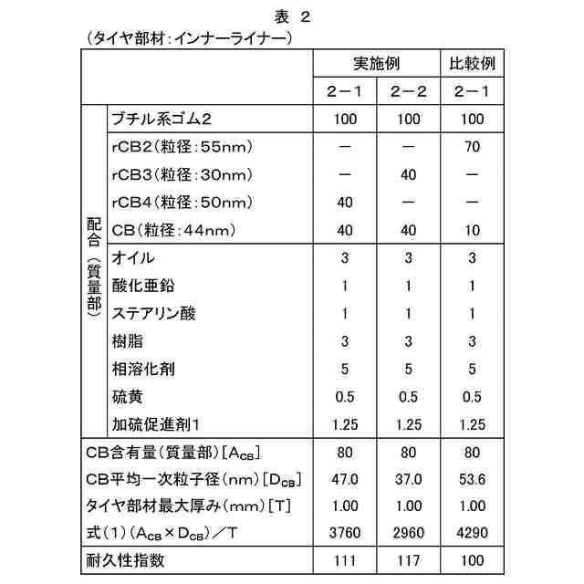 理論に拘束されることは意図しないが、本実施形態のタイヤにおいて、再生カーボンブラックを用いて環境負荷に配慮しながらも、タイヤの耐久性が向上するメカニズムとしては以下が考えられる。すなわち、(1)使用済みタイヤの熱分解から得られる再生カーボンブラックは通常のカーボンブラックに比べて表面反応性が低いため、ゴム組成物中での物理的結合力が低下した状態にあるが、再生カーボンブラックを含むカーボンブラックの粒子径を小さくし、比表面積を大きくすることで、ポリマーとの物理的結合力が向上し、補強強度の向上に寄与すると考えられる。また、(2)補強性の観点からは、再生カーボンブラックを含むカーボンブラックの粒子径を小さくすることでカーボンブラックの使用量を抑えることが可能になる一方、部材の厚みの増加により補強性をさらに向上させることが可能になるという関係にある。したがって、カーボンブラックの使用量と粒子径の積をタイヤ部材の最大厚みで除した値を一定値以下とすることで、補強強度の維持・向上に寄与すると考えられる。そして、上記(1)と(2)とが協働することで、再生カーボンブラックを用いて環境負荷に配慮しながらも、タイヤの耐久性が向上するという極めて優れた効果が得られているものと考えられる。