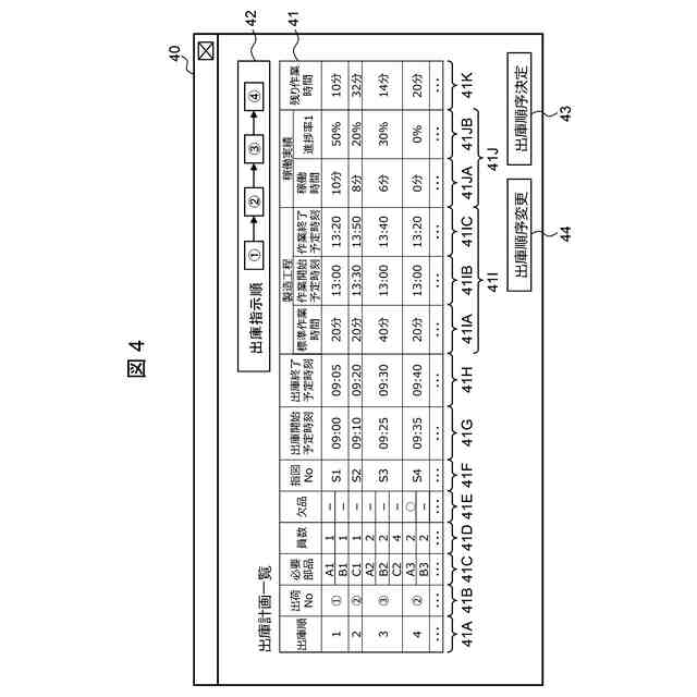 次の所定期間に実行される製品の各製造工程にそれぞれ対応させて作成された、当該製造工程の内容を表す製造指図を取得し、製造指図ごとに、当該製造指図に対応する製造工程で必要となるすべての部品の出庫の計画を纏めた出庫計画をそれぞれ生成し、各出庫計画に基づいて、対応する部品の倉庫からの出庫を指示する出庫指示信号を生成し、生成した出庫指示信号を出力するようにした。