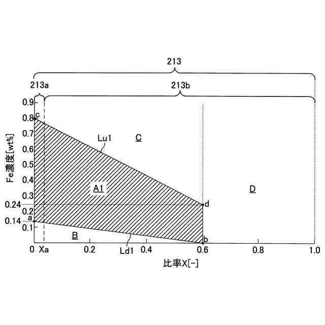 前記比率Xが0以上0.6以下である位置に存在するFeの濃度が、(-28X/60+0.28)wt%以上であり、且つ、(-39X/60+0.56)wt%以下である、