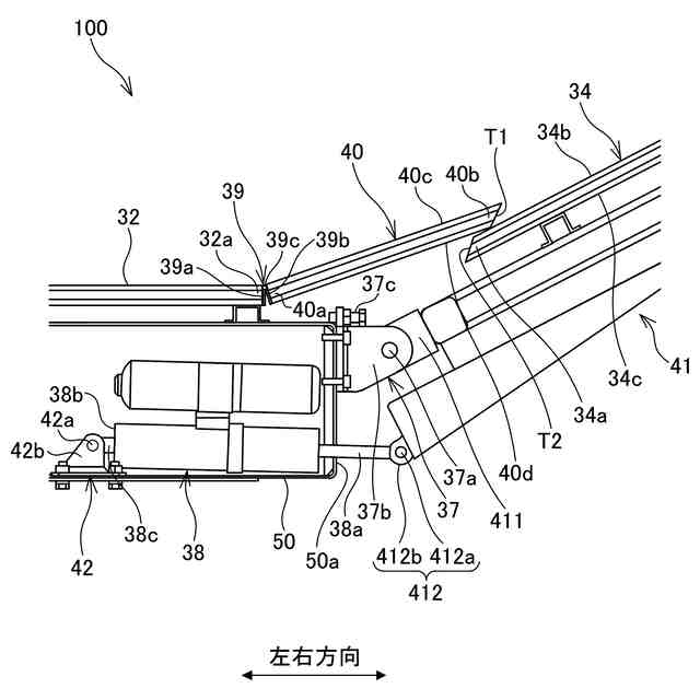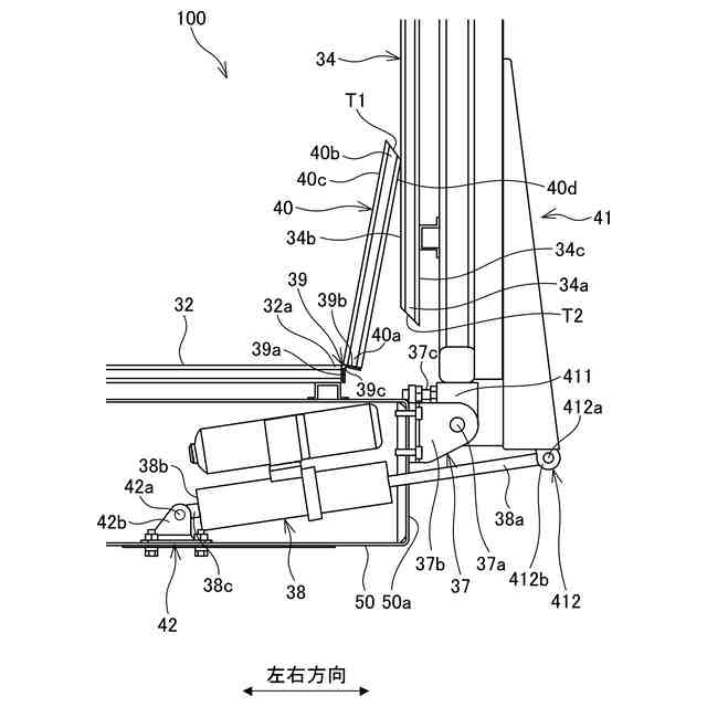 これに対し、床の下方にあるフレーム等に側壁を回動自在に支持すれば、外観への影響を避けることができる。この場合、側壁の回動中心位置によっては、回動する側壁が床と干渉するので、側壁と床とが干渉しない位置に側壁の回動中心位置が設定される一方、このように回動中心位置を設定すると、デッキ状態の床と側壁との間に隙間が生じる。このため、隙間を埋める必要があるが、隙間は例えば、隙間埋め材を手作業で設置することで埋めることができる。