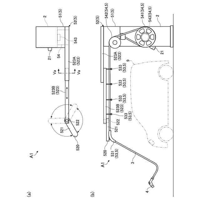 上記充電ポートの位置は、全ての電気自動車で同じではなく、車体の前方に配置される場合や車体の後方に配置される場合などで、異なることがある。そのため、充電装置の位置と充電ポートの位置とが離れている場合、充電ポートに充電プラグを接続するには、充電ケーブルを引っ張りながら、電気自動車の周囲に沿って、充電ケーブルを引き回す必要がある。また、電気自動車の充電完了後に、充電プラグおよび充電ケーブルをコネクタ保持装置に収納する際には、充電ケーブルを引っ張りながら、充電ケーブルをケーブルフック(特許文献1のケーブル保持部)に巻き付ける必要がある。充電ケーブルは、太くて重たいものがあるため、充電装置の利用者は、充電プラグの移動において、充電ケーブルの引き出しや巻き付けに、労力が必要となる。