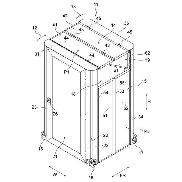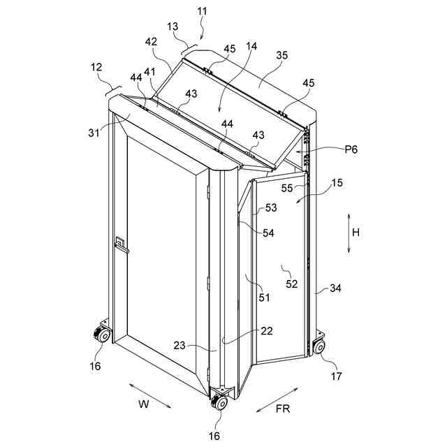 個室ブースは、大別すると天井のないブースと、天井があるブースと、に分けられる。天井がある個室ブースには、消防法により消火設備の設置が義務付けられている。特許文献2のブースにも天井部分に消火装置が設置されている。しかしながら、消火装置は重量が大きく、天井部分を消火装置ごと折りたたむ構造になっていると、折りたたむ際にある程度の力が必要になる。また、折り畳み動作に伴って消火装置が移動する構造になっているため、消火装置を壊さないように慎重に開閉を行う必要がある。
