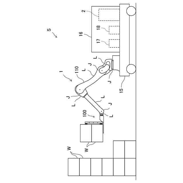 ロボットシステムSは、物品を移送するシステムである。ここでは、所定の位置に積み上げられた物品Wを目的位置に移送する場合について説明する。物品Wは、例えば、段ボール箱である。ロボットシステムSは、物品Wを移送するロボット1と、ロボット1を制御する制御装置2とを備えている。