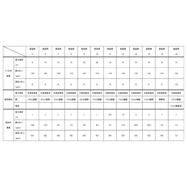 緑色野菜、銅イオン及び亜鉛イオンの中から選ばれる1以上の金属イオン、並びに、水を含有し、
