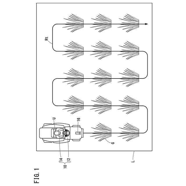 作業用移動体12は、移動しながら、草刈り等の作業を行う。図1に示す例では、作業用移動体12は、土地L内を、予め決められた移動経路Rtに沿って移動する。作業用移動体12は、土地L内を、移動しながら、土地Lに生えている草Gを刈っていく。なお、本実施形態では作業用移動体12によって草刈りの作業が行われるが、作業はこれに限られない。作業は、例えば、農作業、清掃作業、土木作業、運搬作業等であってもよい。