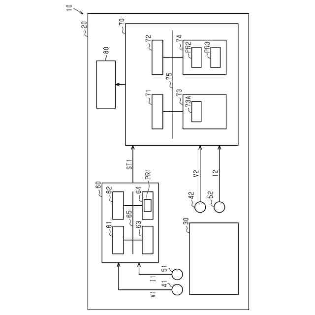 図1に示すように、車両10は、車載システム20を備えている。車載システム20は、補機バッテリ30と、第1電圧センサ41と、第2電圧センサ42と、第1電流センサ51と、第2電流センサ52と、を備えている。