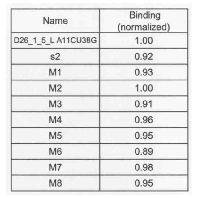 doped(including candidate2)(配列番号:5)という配列的特徴を持つことを、本発明者らは明らかにした。さらに、candidate1とcandidate2に繋がる上記Doped libraryを作製するための配列群の同定の際に結合活性が観察された全配列の特徴をまとめ、Lb05N40(配列番号:2)という共有配列を見出すことが出来た。