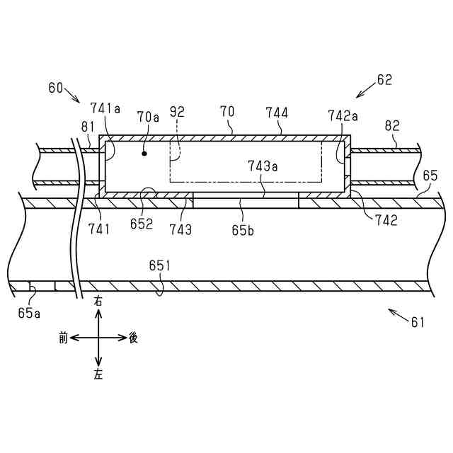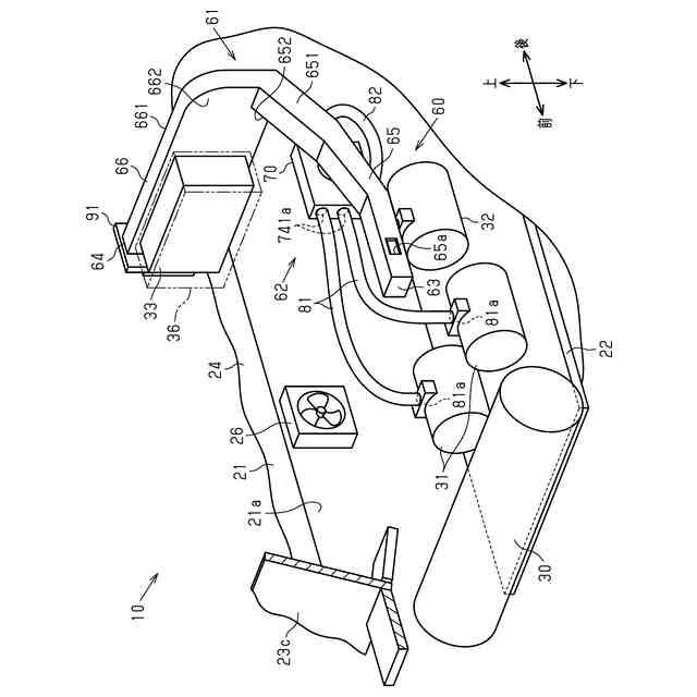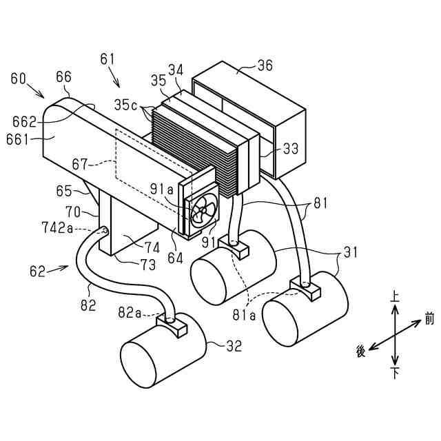 流入口から流出分岐口に向かって流れた空気は、流出分岐口において第1冷却配管から流出するとともに、流入分岐口を介して第2冷却配管に流入する。第2冷却配管に流入した空気は、第2冷却配管の内部を排気口に向けて流動する。第2冷却配管の内部を流動した空気は、第2冷却配管の外部へ排気口より排気される。排気口から排気された空気は、駆動モータを冷却する。