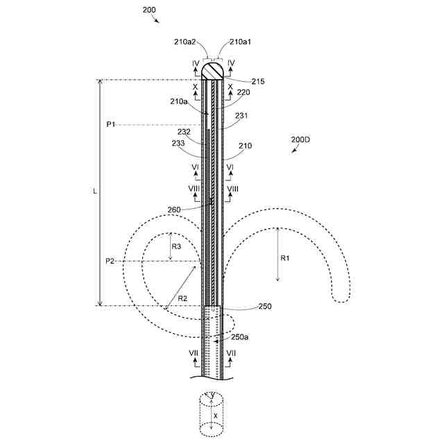 図1に示すように、従来のカテーテル100では、ワイヤの操作によりカテーテル遠位部100Dを一方側又は他方側に湾曲させることができるが、1回の湾曲につき1本のワイヤを引くため、例えば1つの曲率半径r1又はr2を有する湾曲等、一段階の湾曲とすることしかできなかった。このような従来のカテーテル100では、カテーテル100を病変部に送達する際にカテーテル遠位部100Dを所期の形状に湾曲させることが困難な場合があり、別のガイディングシースを用いる等の方法によりカテーテル遠位部100Dの湾曲形状を調整する必要があった。