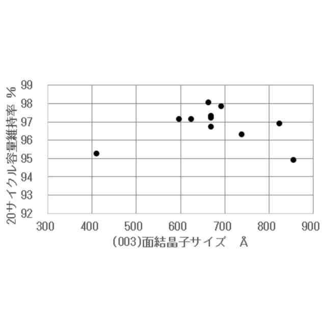 発明の詳細な説明【技術分野】 【0001】 本発明は、リチウムイオン電池用正極活物質の評価方法及びリチウムイオン電池用正極活物質に関する。 続きを表示(約 3,200 文字)【背景技術】 【0002】 近年、携帯電話、ノートパソコン等の小型電子機器の急速な拡大とともに、充放電可能な電源として、非水系電解質二次電池の需要が急激に伸びている。非水系電解質二次電池の正極活物質としては、コバルト酸リチウム(LiCoO 2 )で代表されるリチウムコバルト複合酸化物とともに、ニッケル酸リチウム(LiNiO 2 )で代表されるリチウムニッケル複合酸化物、マンガン酸リチウム(LiMnO 2 )で代表されるリチウムマンガン複合酸化物等が広く用いられており、これらを用いたリチウムイオン電池用正極活物質の研究・開発が盛んに行われている。 【0003】 特許文献1には、組成が次式:Li a Ni b Co c Mn d O 2 (式中、1.00≦a≦1.02、0.8≦b≦0.9、b+c+d=1である)で表される正極活物質粒子と、正極活物質粒子の表面を部分的に被覆するニオブ酸リチウムを含む被覆層と、を有し、Ni、Co及びMnの総量に対するNbの割合が0.4~1.2mol%であるリチウムイオン電池用正極活物質が開示されている。そして、このような構成によれば、良好な電池特性を有するリチウムイオン電池用正極活物質を提供できると記載されている。 【先行技術文献】 【特許文献】 【0004】 特開2019-139862号公報 【発明の概要】 【発明が解決しようとする課題】 【0005】 リチウムイオン電池用正極活物質の開発において、電池特性であるサイクル特性を評価することは重要である。しかしながら、電池特性の評価には精緻なセル電極を作製し、充放電試験機により数日間充放電を繰り返し行うことでデータを取得するため、結果判明までに時間がかかるという問題がある。 【0006】 本発明は、上記のような課題を解決するためになされたものであり、電池を作製することなく、効率よくサイクル特性を評価することが可能なリチウムイオン電池用正極活物質の評価方法及びリチウムイオン電池用正極活物質を提供することを目的とする。 【課題を解決するための手段】 【0007】 上記知見を基礎にして完成した本発明は以下で規定される。 (1)それぞれ、組成式:Li a Ni (1-b-c-d) Co b Mn c M d O 2 (式中、MはMg、Al、Ca及びTaから選択される一種以上であり、0.98≦a≦1.10、0.13≦b≦0.22、0.02≦c≦0.32、0≦d≦0.007である。) で表される一群のリチウムイオン電池用正極活物質のXRD回折パターンを測定する工程と、 前記正極活物質のXRD回折パターンから、シェラーの式を用いて(003)面の結晶子サイズを算出する工程と、 前記正極活物質のうち、(003)面の結晶子サイズが各々異なる正極活物質を電池の電極材料として用いて作製された各電池についてサイクル特性評価を行い、得られたサイクル特性評価結果と、前記正極活物質の前記結晶子サイズとの相関関係を導く工程と、 前記相関関係に基づいて、前記一群の正極活物質の前記結晶子サイズに対応する評価用正極活物質の前記結晶子サイズを測定し、前記評価用正極活物質の前記結晶子サイズから、前記評価用正極活物質のサイクル特性の評価を行う工程と、 を含む、リチウムイオン電池用正極活物質の評価方法。 (2)前記正極活物質が、組成式:Li a Ni (1-b-c-d) Co b Mn c M d O 2 (式中、MはMg、Al及びCaから選択される一種以上であり、1.03≦a≦1.10、0.18≦b≦0.22、0.28≦c≦0.32、0≦d≦0.007である。) で表される、前記(1)に記載のリチウムイオン電池用正極活物質の評価方法。 (3)前記評価用正極活物質の前記結晶子サイズが580~840Åであれば、前記評価用正極活物質のサイクル特性を良好と評価する、前記(2)に記載のリチウムイオン電池用正極活物質の評価方法。 (4)前記正極活物質が、組成式:Li a Ni (1-b-c-d) Co b Mn c M d O 2 (式中、MはTaであり、0.98≦a≦1.09、0.13≦b≦0.16、0.02≦c≦0.05、0≦d≦0.007である。) で表される、前記(1)に記載のリチウムイオン電池用正極活物質の評価方法。 (5)前記評価用正極活物質の前記結晶子サイズが400~650Åであれば、前記評価用正極活物質のサイクル特性を良好と評価する、前記(4)に記載のリチウムイオン電池用正極活物質の評価方法。 (6)組成式:Li a Ni (1-b-c-d) Co b Mn c M d O 2 (式中、MはMg、Al及びCaから選択される一種以上であり、1.03≦a≦1.10、0.18≦b≦0.22、0.28≦c≦0.32、0≦d≦0.007である。) で表されるリチウムイオン電池用正極活物質であって、前記正極活物質のXRD回折パターンを測定し、前記正極活物質のXRD回折パターンから、シェラーの式を用いて(003)面の結晶子サイズを算出した際に、前記結晶子サイズが580~840Åである、リチウムイオン電池用正極活物質。 (7)組成式:Li a Ni (1-b-c-d) Co b Mn c M d O 2 (式中、MはTaであり、0.98≦a≦1.09、0.13≦b≦0.16、0.02≦c≦0.05、0≦d≦0.007である。) で表されるリチウムイオン電池用正極活物質であって、前記正極活物質のXRD回折パターンを測定し、前記正極活物質のXRD回折パターンから、シェラーの式を用いて(003)面の結晶子サイズを算出した
