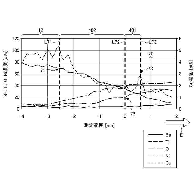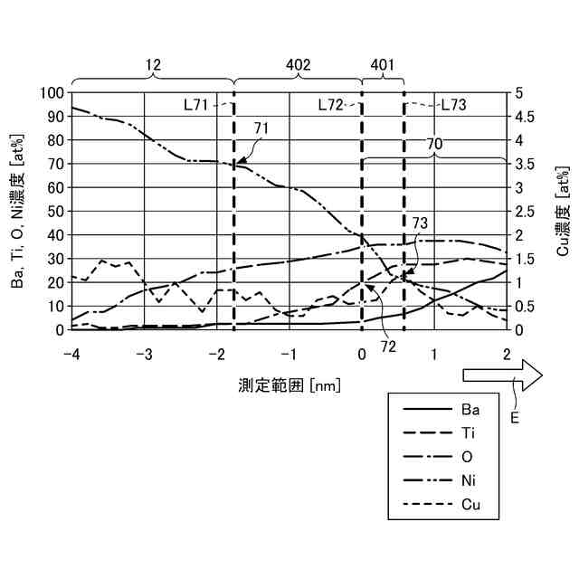 ペロブスカイト構造の誘電体を含む誘電体層11と、主成分としてニッケルを含む内部電極層12a、12bと、銅を含有する第1中間領域401を有し、Z軸に沿って分析を行った場合、第1中間領域は、ニッケル濃度が70at%未満かつBサイト元素の濃度が20at%以上になる領域のうちBサイト元素の濃度が20at%になる第1境界部と、銅濃度のピークである第2境界部とで挟まれた領域であり、銅濃度のピークにおける銅濃度が1.0at%以上5.0at%以下、銅濃度のピーク位置における銅濃度をC(Cu)、Bサイト元素の濃度をC(B)、Aサイト元素の濃度をC(A)とした場合に、式(1)で求められる濃度Cが10at%以上35at%未満である。