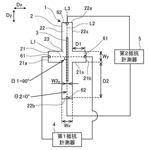 前記第2板部の延在方向に離間して前記第2板部に設けられた第2の一対の点の間の第2電気抵抗を計測するための第2抵抗計測器と