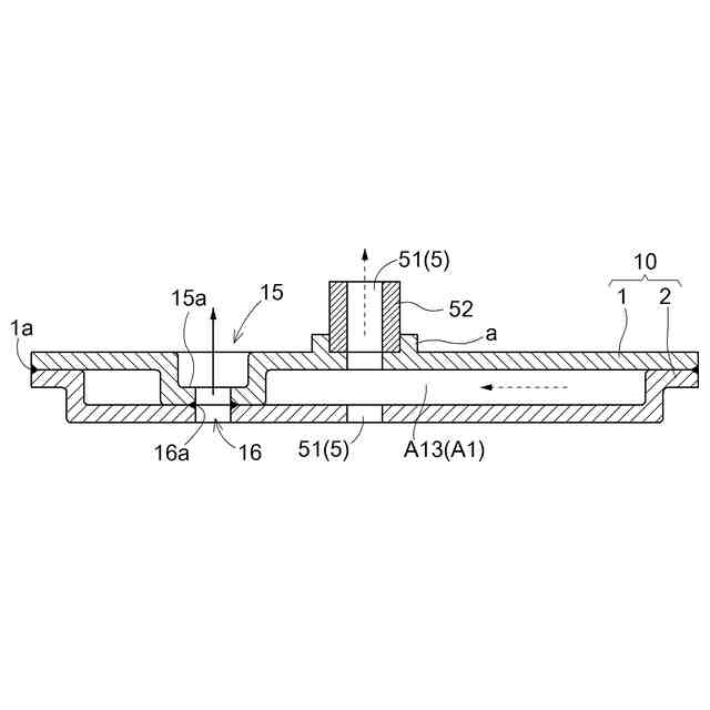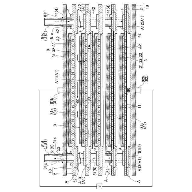 発明者らは、以下述べる新たな課題を見い出し、本発明の構成に想到した。上述した従来の板状支持体では、第1板状体と第2板状体とが外周縁部の溶接により接合されている。そのため、外周縁部から離れた位置では第1板状体と第2板状体との距離にバラツキが生じる可能性がある。その場合、内部流路の高さにバラツキが生じるので、高さが大きい領域がショートパス経路となり、電気化学反応部に供給されずに排出される第1ガスが増加してしまう可能性がある。また、複数の電気化学素子の間で内部流路の高さにバラツキが生じ得る。その場合、複数の電気化学素子の間で内部流路の圧力損失にバラツキが生じ、複数の電気化学素子の間で第1ガスの供給量が不均一になってしまう可能性がある。