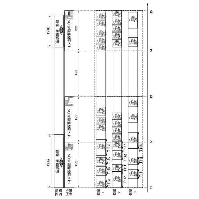 一般的に、ビル内に設置された空調設備、照明設備、防災設備、防犯設備等の電気設備は、数時間から数日間といった比較的長い時間長でその駆動状態を切り替えられる。一方、大便器、小便器、温水洗浄便座、自動水栓、ハンドドライヤー等のトイレ機器の駆動状態は、数秒から数分といった比較的短い時間長で変化することが殆どである。