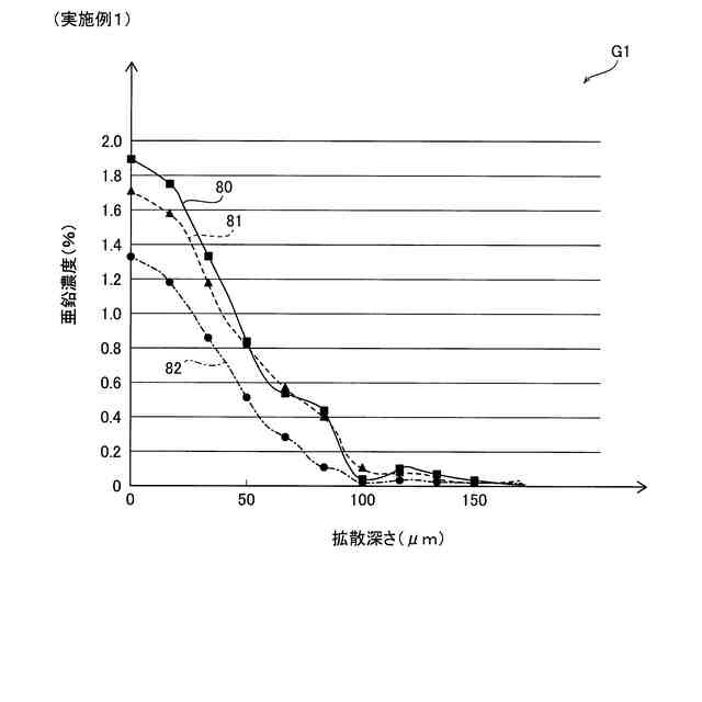 ここで、濃度勾配を有する亜鉛拡散層では、亜鉛の濃度が高い部分が、亜鉛濃度が低い部分よりも先に腐食する。したがって、表面の亜鉛濃度が最も高く、深さ方向(熱処理型アルミニウム合金材の中心に近づく方向)に進むにつれて亜鉛濃度が低くなるように亜鉛拡散層を形成することにより、亜鉛拡散層を形成した熱処理型アルミニウム合金材の表面付近で腐食が進行しやすくなる。この場合、亜鉛拡散層を形成した熱処理型アルミニウム合金材では、亜鉛濃度が徐々に低くなる熱処理型アルミニウム合金材の深さ方向ではなく、亜鉛濃度が高い熱処理型アルミニウム合金材の表面に沿う方向に腐食が進行する。そのため、熱処理型アルミニウム合金材において、局部的に孔状に腐食する孔食が生じることを抑制することができる。したがって、上記のように、第1温度で第1熱処理を行うことにより、熱処理型アルミニウム合金材の表面から100μmの深さ範囲において、熱処理型アルミニウム合金材の表面から深さ方向に進むにつれて亜鉛濃度が低くなるような濃度勾配を有する亜鉛拡散層が形成されるので、熱処理型アルミニウム合金材の耐食性を向上させることができる。また、第1温度で第1熱処理を行うことにより、3000系のO材のアルミニウム合金材の機械的強度よりも機械的強度が高くなる。これらの結果、耐食性を確保しつつ、3000系のO材のアルミニウム合金材の機械的強度よりも機械的強度が高い熱処理型アルミニウム合金材を取得することができる。なお、亜鉛の濃度は、亜鉛拡散層中に含まれる亜鉛の重量パーセント(wt%)により示している。