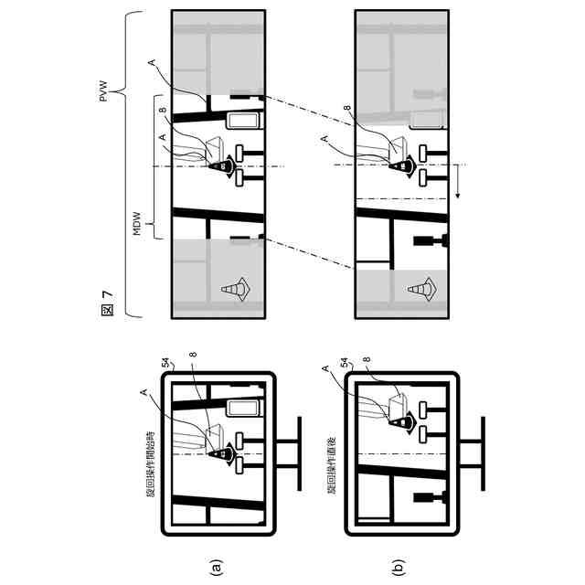 旋回操作開始時から旋回操作後までのパノラマ映像および表示装置に表示される表示態様を示す図である。