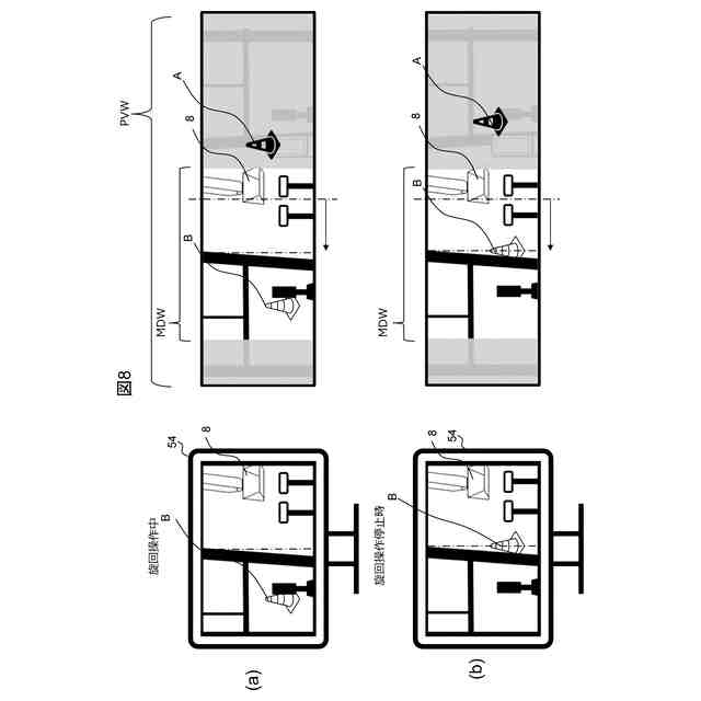 旋回操作中から旋回操作停止までのパノラマ映像および表示装置に表示される表示態様を示す図である。